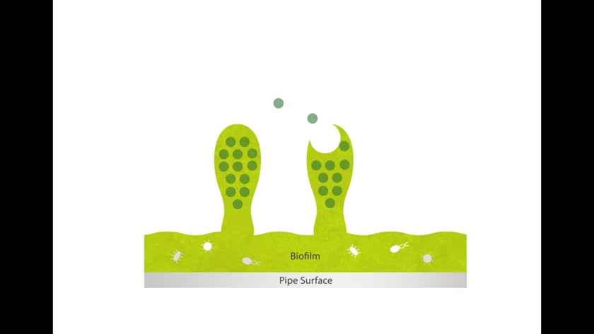 Once attached, the microorganisms produce a matrix of extracellular polymeric substances (EPS) that hold the community together and protect it from environmental stresses, such as chlorine disinfection and changes in water flow.